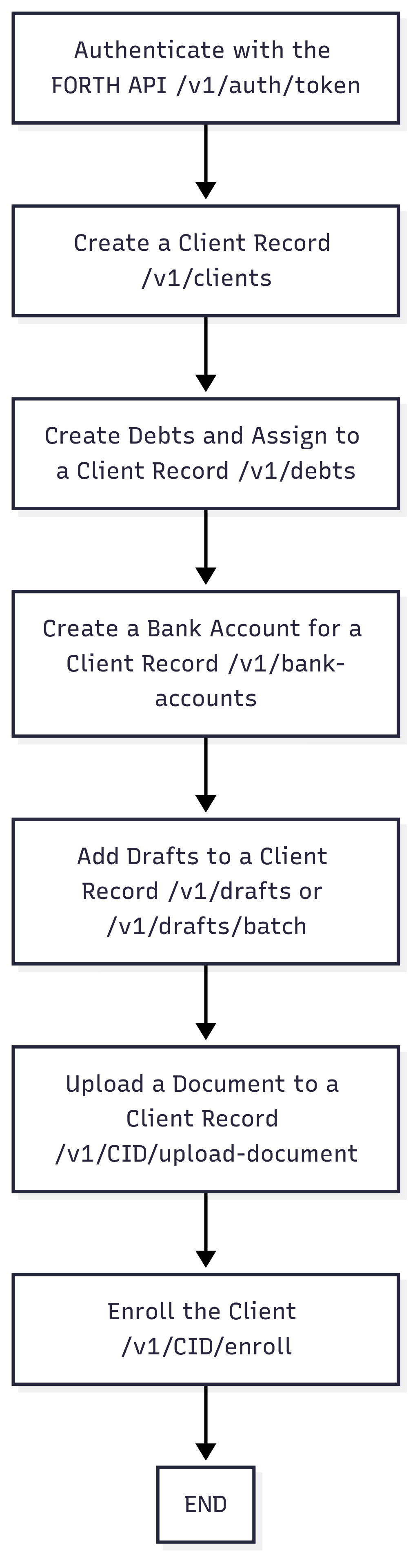 Once all prior steps have been followed you can enroll the customer via the enroll endpoint. This will mark the contact as ‘enrolled’ in the system and will be reviewed by the FORTH team before the intial hold is released and the client begins making payments into their program. You can check the status of a hold on the get client endpoint and reviewing the dpg_hold object in the response.